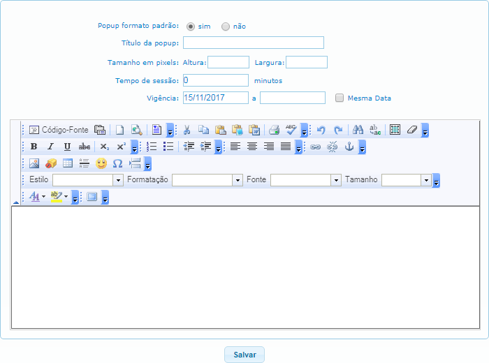 8.a. PopUp Formato Padrão: Selecione se o formato da popup é padrão ou não. Se a popup for simplesmente texto, criada e montada através do CK Editor, consideramos padrão. Se a popup apresentar qualquer tipo de imagem, consideramos não padrão.